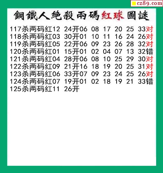 钢铁人杀两码红球125期双色球图谜