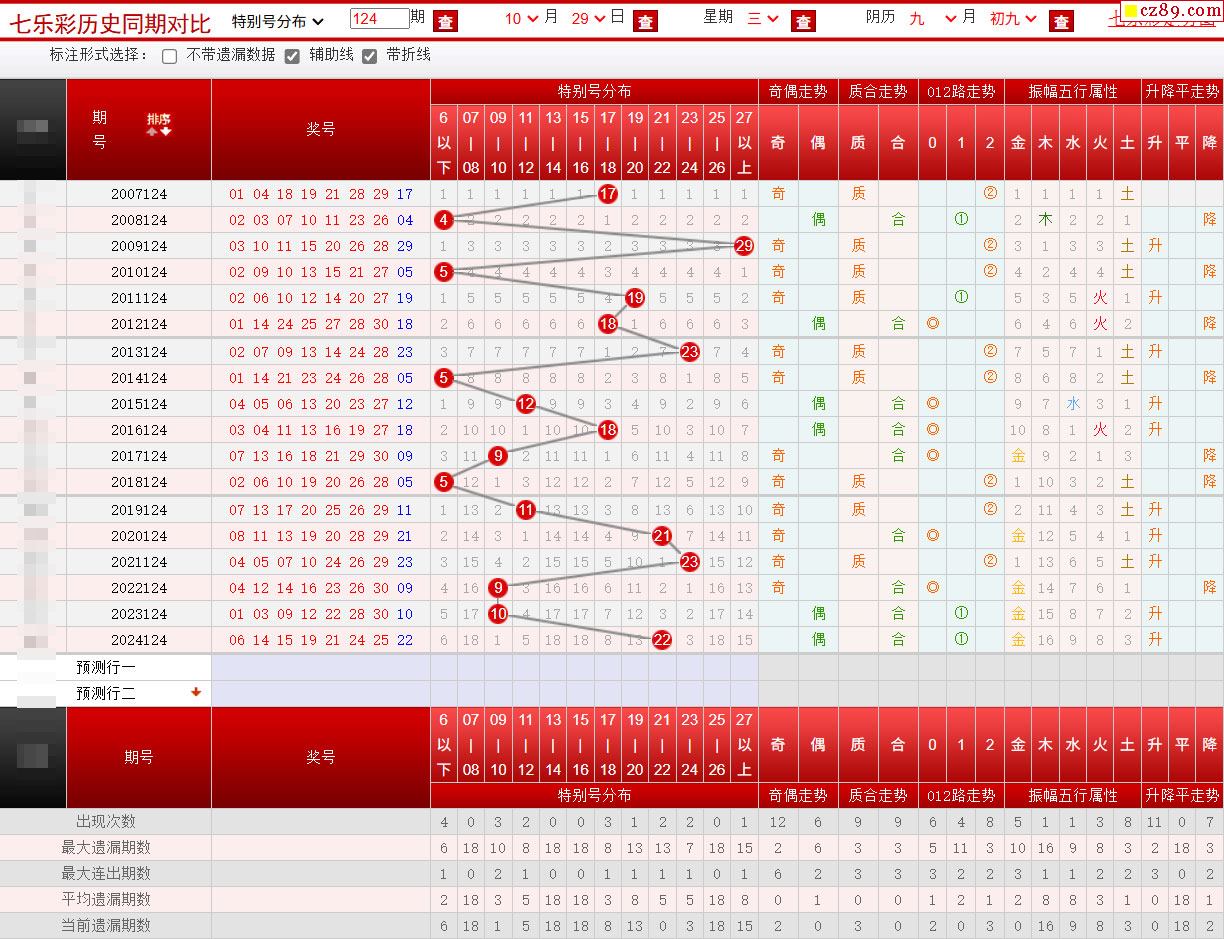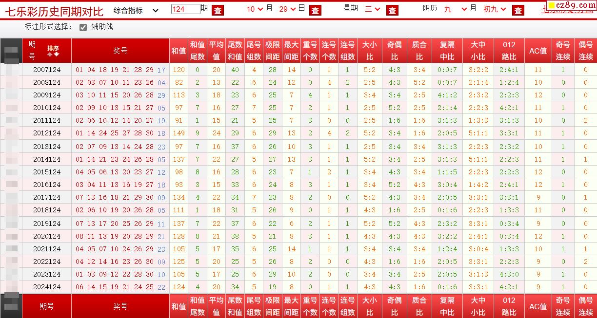 > 124期七乐彩历史同期对比图